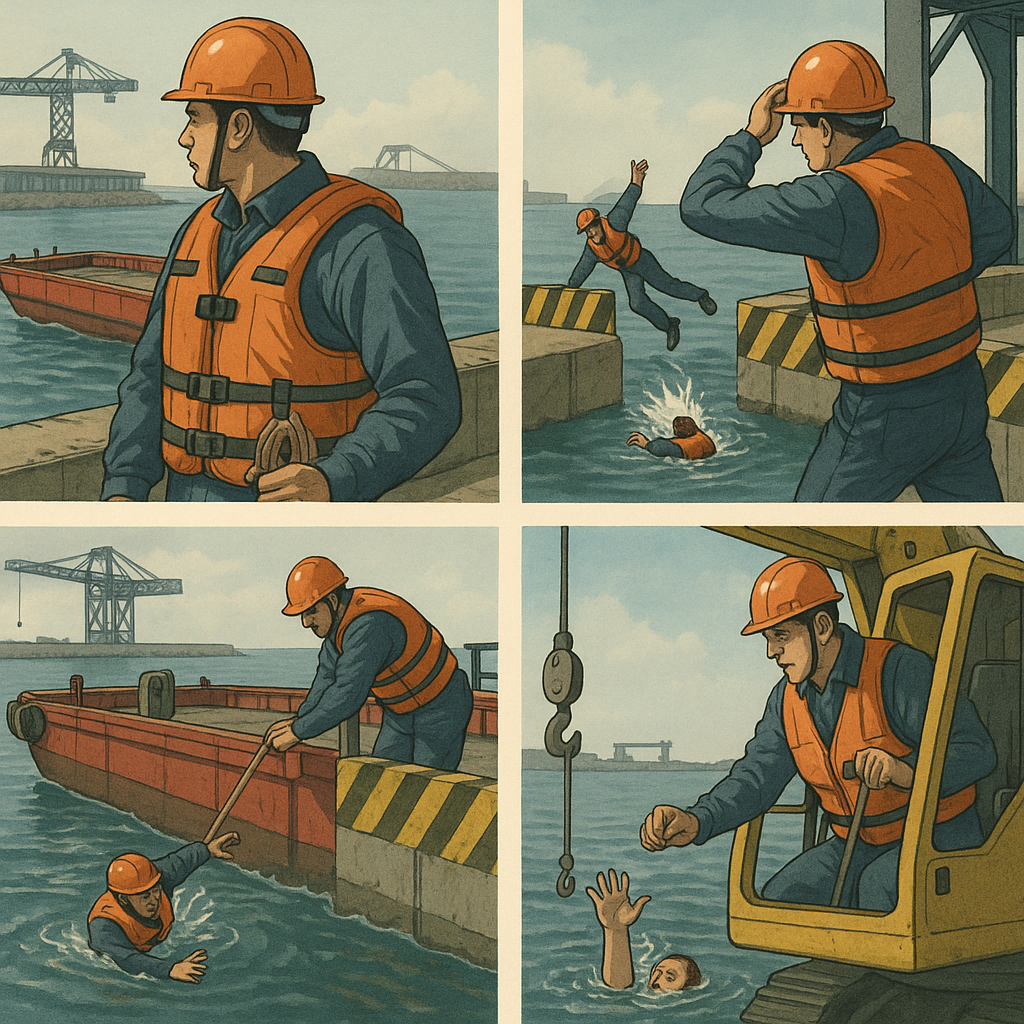 한 조선소 방파제 공사 현장에서 바지선 고정용 로프 해체 작업 중, 해상에 추락하여 작업자가 익사한 사고가 있었습니다. 사고 당시 작업자는 구명조끼를 착용하지 않았으며, 주변에 즉각 구조할 인력이 배치되어 있지 않았습니다.